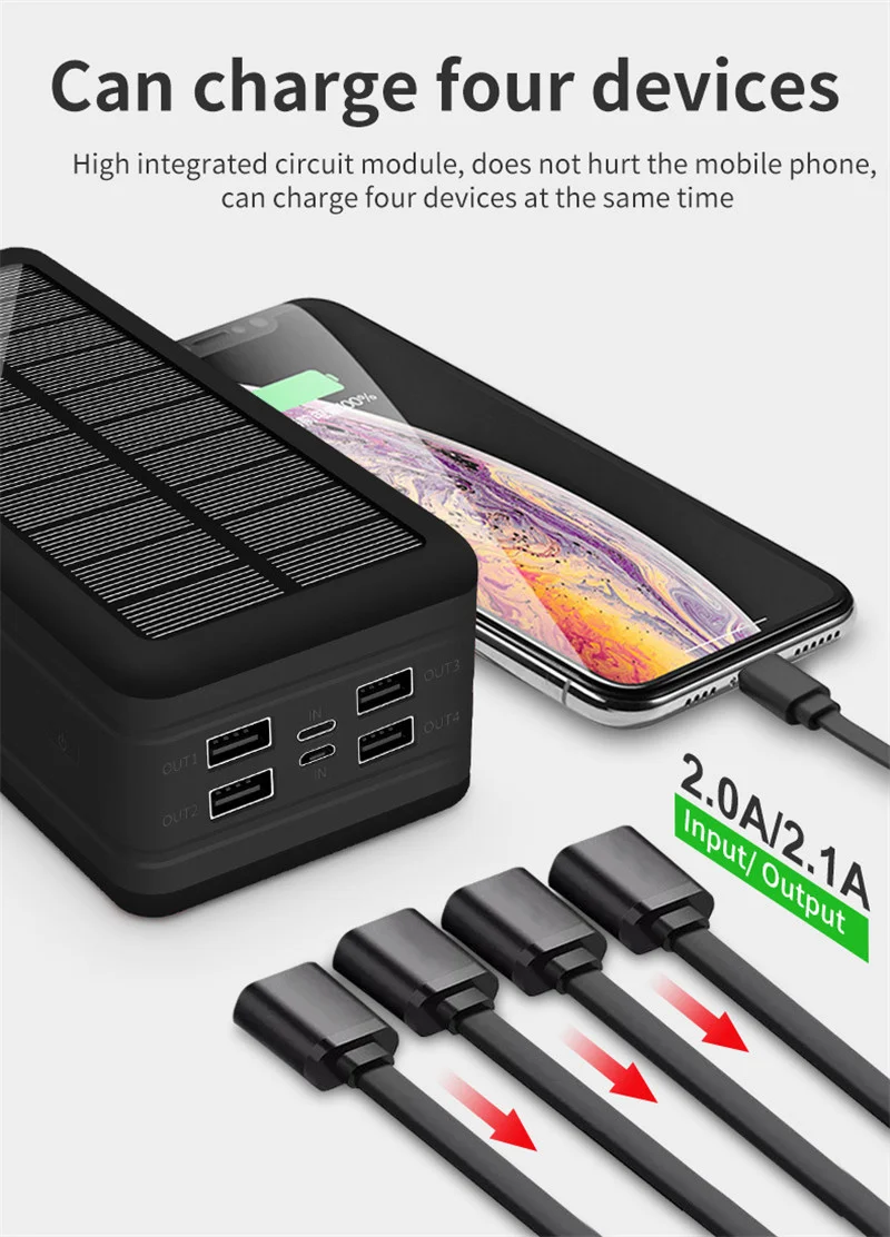 Wireless and solar energy: 99000 MAH solar wireless power bank. It is not only a wireless power library, but also a wireless charger that supports iPhone XR / XR max / XS / X / 8 / 8plus, Samsung Galaxy S9 / s9plus S8 / s8plus and all Qi compatible mobile devices.