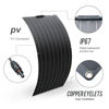 Feature:a.monocrystalline cell than poly ones.b.Flexbile,soft,light for long lifespan.c.More durable: PET Surface make it more durable,waterproof,High light transmittance.d.IP67 Junction box: A bypass diode is included to provide input overcurrent protection and reverse protection.e.PV connector: plug and play.Heat-resistant and waterproof.Application:Suitable for RVs, households, camping, yachts, street lamps and solar power plants, etc.better use with controller and battery together.150W Black Flexible Solar PanelSpecification:Maximum power(Pmax) 150WOutput tolerance ± 3%Maximum system voltage 700V DCOpen circuit voltage(Voc) 21.6VMaximum power voltage(Vmp) 18VCell efficiency 19.5%Operating temperature(NOCT) 45±2Temperature range -40-+80Number of cells 36pcsWeight 2200gSize 1170*540*3 mmbackboard blackStandard Test Conditions : lrradiance 1000w/m2,Temperature 25,AM=1.5Package list1 or 2*150w flexible solar panel(optional)1*12v/24v 20A controller (optional)1* 3meters 2.5mm² alligator clips(optional)1*3meters 2.5mm² PV Connector (optional)1* 2 in 1 adapter (optional)150W White Flexible Solar PanelPackage List1 or 2*150w flexible solar panel(optional)1*12v/24v 20A controller (optional)1* 3meters 2.5mm² alligator clips(optional)1*3meters 2.5mm² PV Connector (optional)1* 2 in 1 adapter (optional)50w flexible solar panelSpecification:Maximum power(Pmax) 50WOutput tolerance ± 3%Maximum system voltage 700V DCOpen circuit voltage(Voc) 19.2VShort circuit current(Isc) 3.43AMaximum power voltage(Vmp) 16VMaximum power current(Imp) 3.12ACell efficiency 19.5%Operating temperature(NOCT) 45±2Temperature range -40-+80Number of cells 32pcsWeight 1030gSize 1060*277*3 mmColor BlackStandard Test Conditions : lrradiance 1000w/m^2,Temperature 25, AM=1.5Package list1 pcs or 2 pcs or 4 pcs 50w solar panel (optional)12v/24v 10A/20A controller (optional)3 meter pv cable (optional)3 meter alligator clips cable (optional)2 in 1 adapter or 4 in 1 adapter (optional)