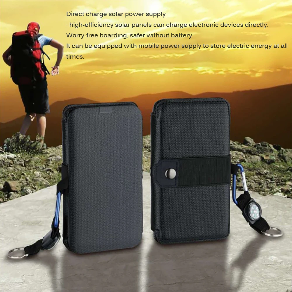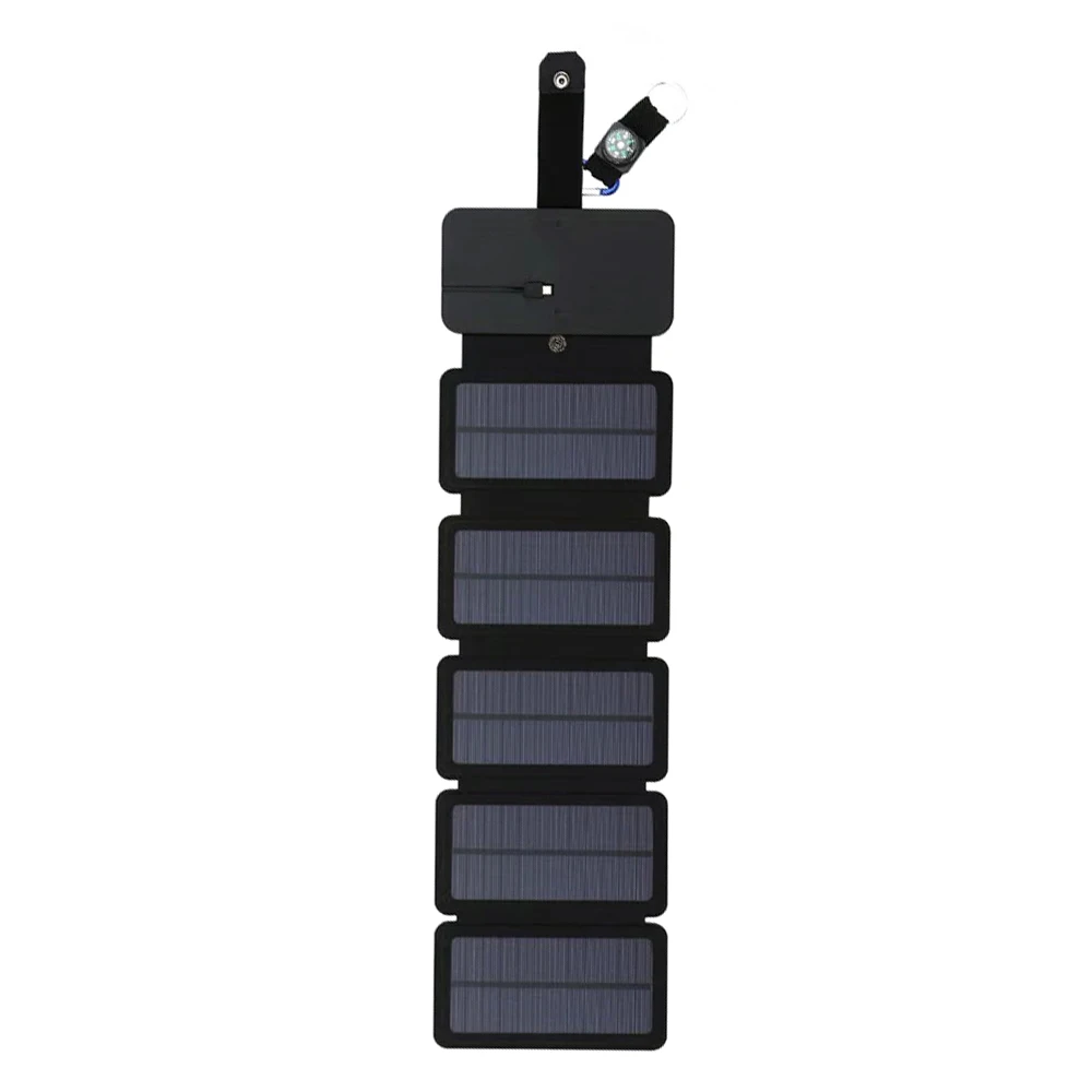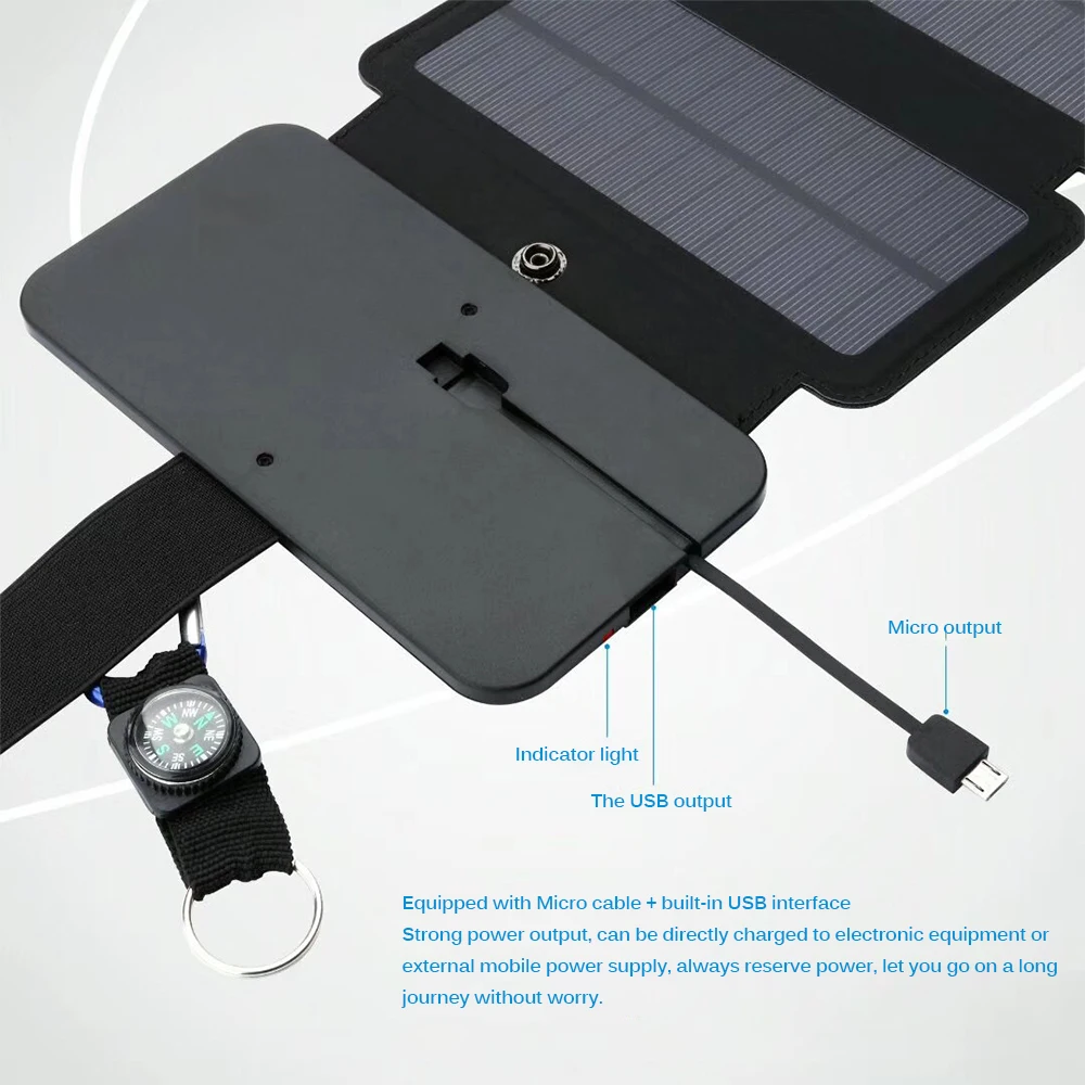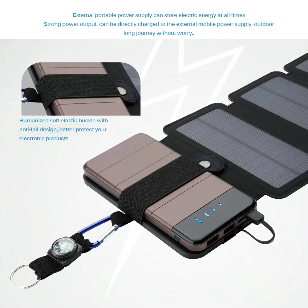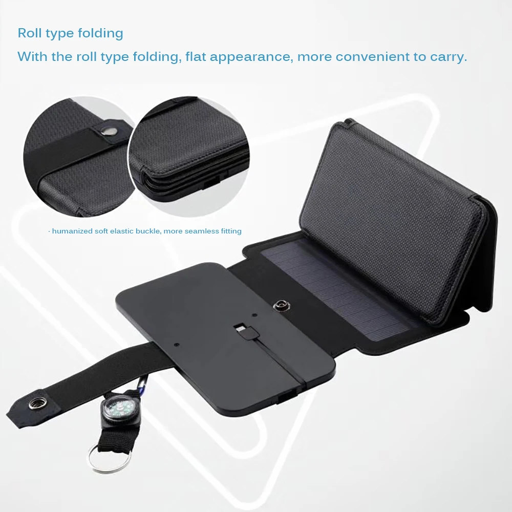 The solar panel has compass hooks design, which is outdoor good match. Solar panel can be folded, it is easy to carry after folding.