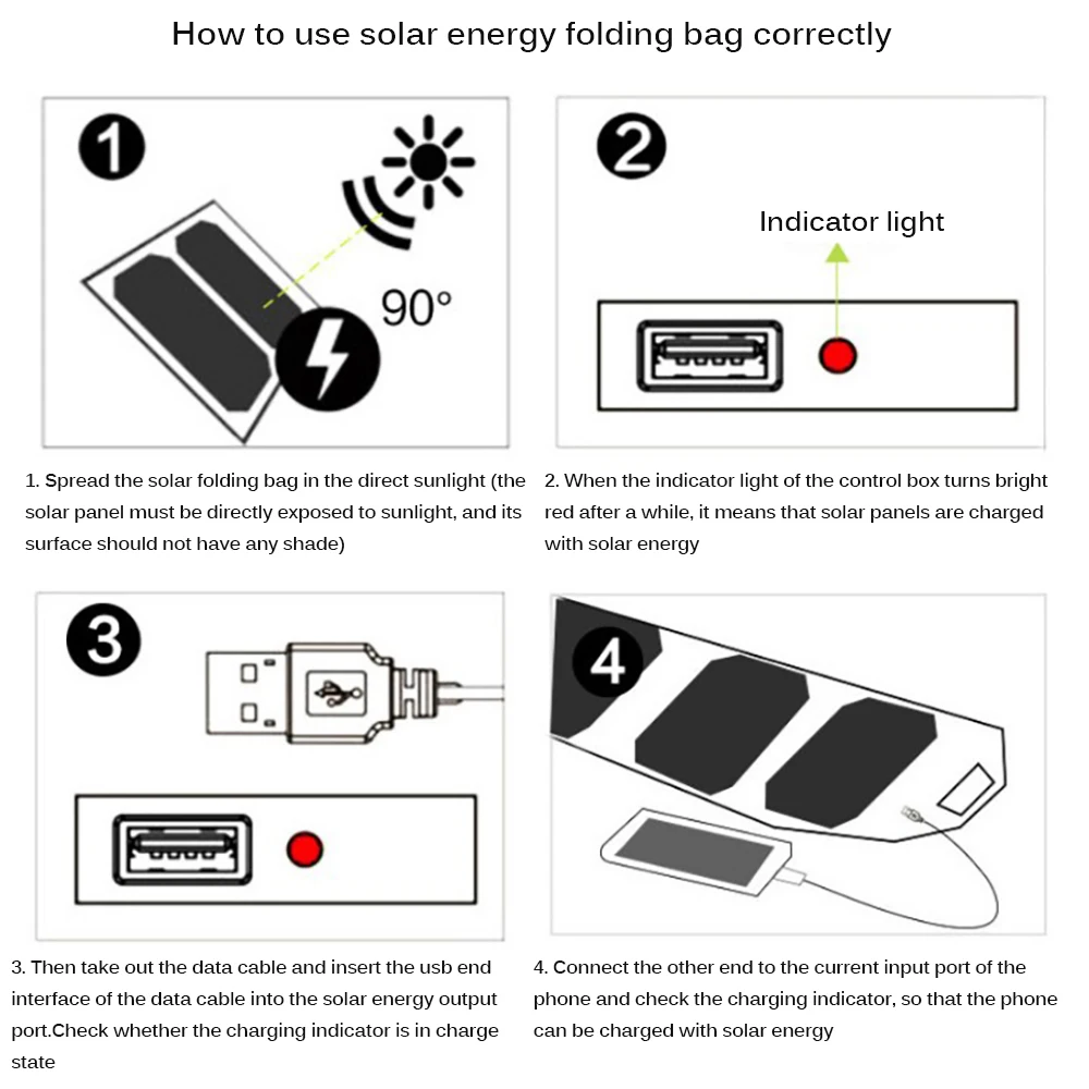 Direct power output of USB interface in sunlight. There is no built-in battery to transfer power, and the power supply is directly supplied to the electronic device through the body’s own Micro line or USB output interface.